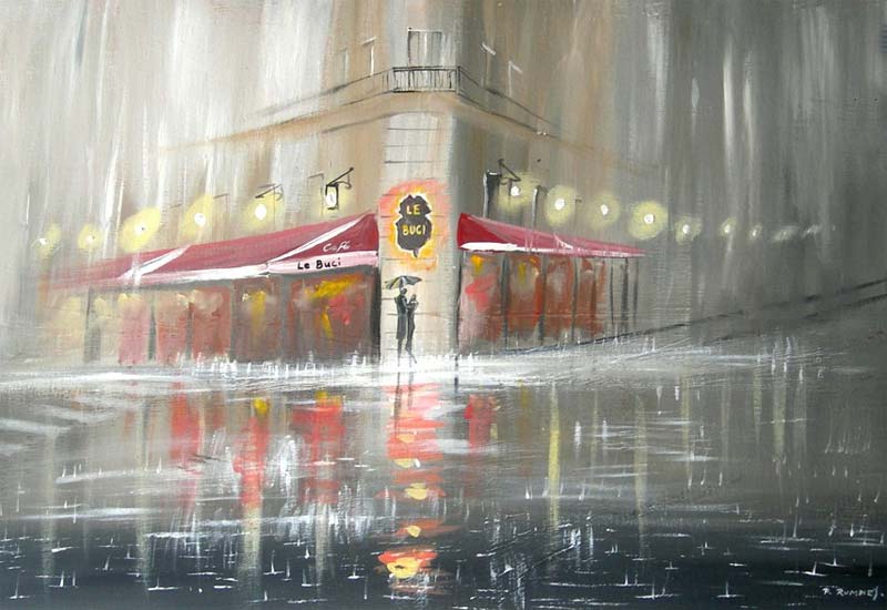 Llueven gotas y mojan casi todas las caras. Incontables piernas se mueven deprisa sobre los adoquines de las aceras salpicándose, en ocasiones embarrándose las pantorrillas o los bajos de los pantalones. Llueven gotas y más gotas. Las piernas andan arriba y abajo, cruzan las calles en vertical, en diagonal, por el paso de peatones. Algunas, las menos, esperan a que el semáforo cambie la luz. Los coches chirrían, suenan, aparcan, desaparcan, en línea, en batería, en doble fila con las luces de posición.
