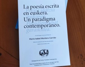 La poesía escrita en euskera. Un paradigma contemporáneo. Lleva las palabras de recepción de Don Carlos María Hernández Basilio y estuve acompañada por Don Íñigo López de Uralde. Al estrado fui con dos queridos amigos, delante Doña Inés Olaran y detrás Don Ignacio Amestoy Eguiguren.