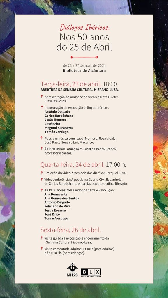 Un placer de formar parte de Diálogos Ibéricos. Del 23 al 27 de abril en Lisboa. En este encuentro honraremos la memoria de nuestro amigo Antonio Mata Huete, gran artífice e impulso para este encuentro en torno a su novela «Claveles Rotos», que no están rotos sino que permanecen vivos en nuestros corazones. Las jornadas además se insertan dentro de las celebraciones para el «50 aniversario de la Revolución de los Claveles» («50º aniversário da revolução dos cravos»).